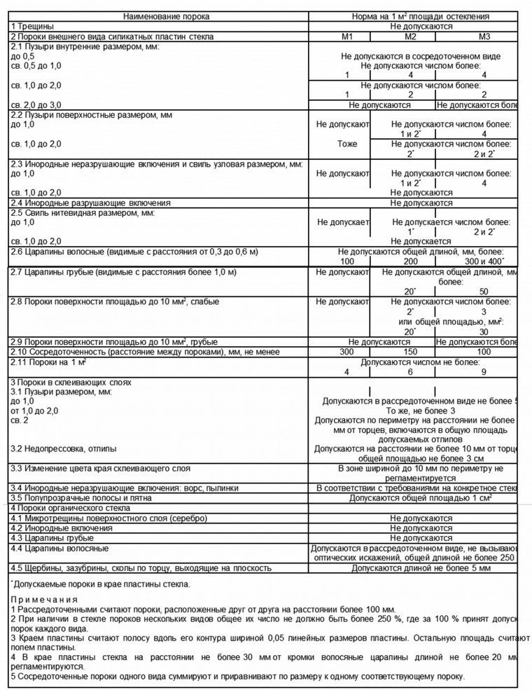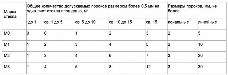 Пороки внешнего вида стекол при использовании листового стекла марок М1, М2, М3 по ГОСТ 111, определяемые визуально, должны соответствовать нормам, указанным в таблице, если они не оговорены особо в нормативных документах на конкретное стекло.